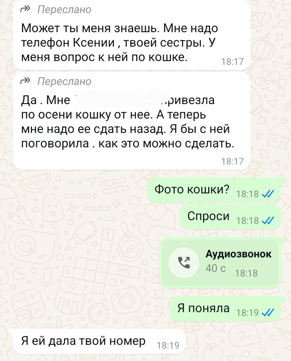 Мне переслала сообщения сестра, я сначала не понимала, я никого в ту сторону осенью не отдавала. Зная наглость многих ,была мысль что просто кто то хочет свою кошку таким образом "пристроить".