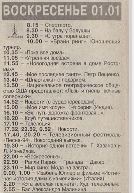 Давайте посмотрим, что было по центральным каналам 1 января 1995 года. Я взял только два канала, которые практически наверняка показывали у всех граждан страны.