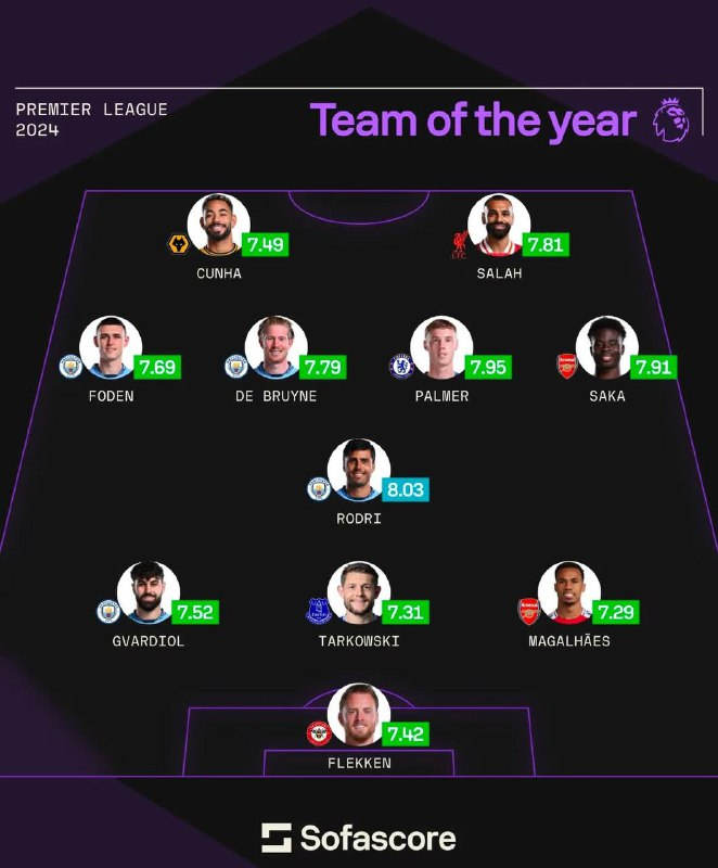 Сборная лучших игроков АПЛ в 2024 году от Sofascore