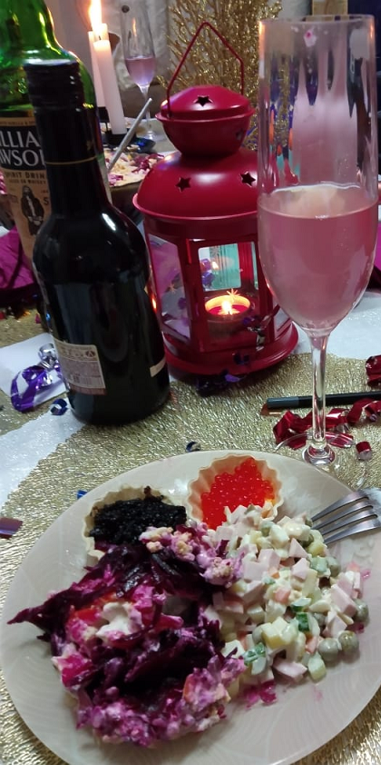 Естественно, у нас огромный стол, который ломился от принесённых салатов и мясных нарезок российского производства (горячее заказали, чтобы хозяину не обидно было). Из напитков - шампанское, вино, виски из дьюти-фри. Икра была. Свечи красивые поставили. Всё, как в России.