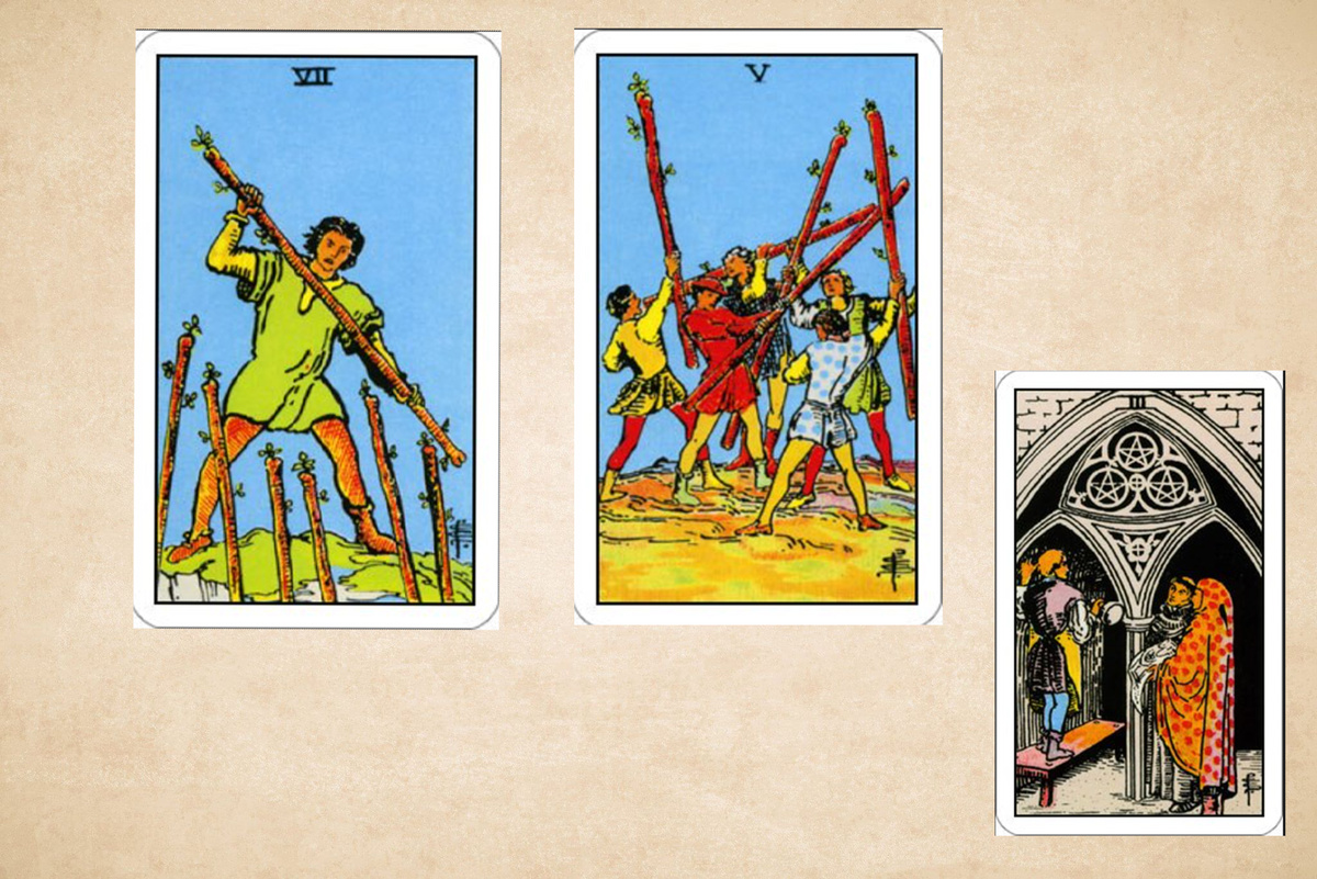 Отчасти было попадание про борьбу организма с чем-то вредным для него (5Ж). Всё-таки гоммаж аккуратно очищает кожу от мёртвых клеток. По сути, это скраб. Вот как именно показала себя 7Ж – сходу сказать сложно, ведь эта Карта больше про защиту границ, про преграду и барьеры, а здесь, наоборот, происходит удаление частиц за счёт механического и химического воздействия. Ну либо на 7Ж как раз и показан сам процесс: жезлы снизу как будто бы готовы нападать и делать своё дело.
