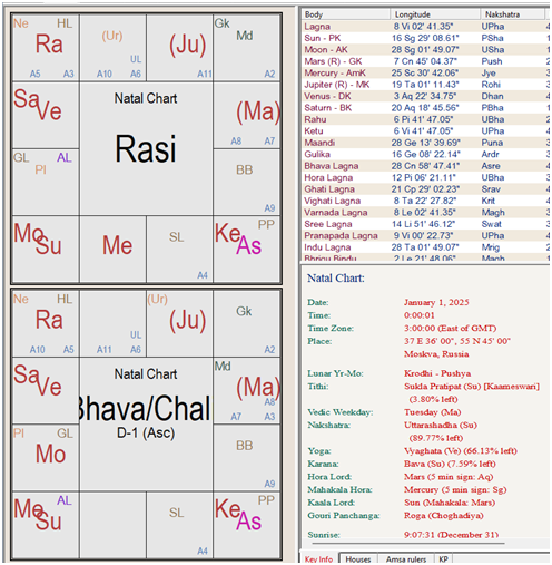 Посмотрим гороскоп для России на 0 часов 0 минут и 1 секунду 1 января 2025 года. Асцендент/лагна (начало гороскопа) попадает в знак Дева – знак систематичный, внимательный к деталям, склонный к анализу, методичный, услужливый в своих лучших проявлениях. Вполне вероятно история событий года больше будет связана с местами где много сельскохозяйственных и промышленных предприятий, медицинских учреждений, офисов. На лагну и 1 дом дейстуют Кету и ретроградный Юпитер через аспект. Обе планеты ожидаемо показывают отработку кармических задач всей страны, народа, как на физическом уровне так и на мировоззренческом, возможно даже религиозном. Финансовый сектор связанный со вторым домом пока еще связан с военными действиями, что показывет 4-й аспект ретроградного Марса на 2-й дом и связь управителя 2-го дома Венеры с сильным Сатурном в 6 доме борьбы и трудностей. Меркурий и снова ретро Юпитер показывают важность в 2025 году сферы коммуникаций и общения, СМИ для всей нации (так как тут прямые связ