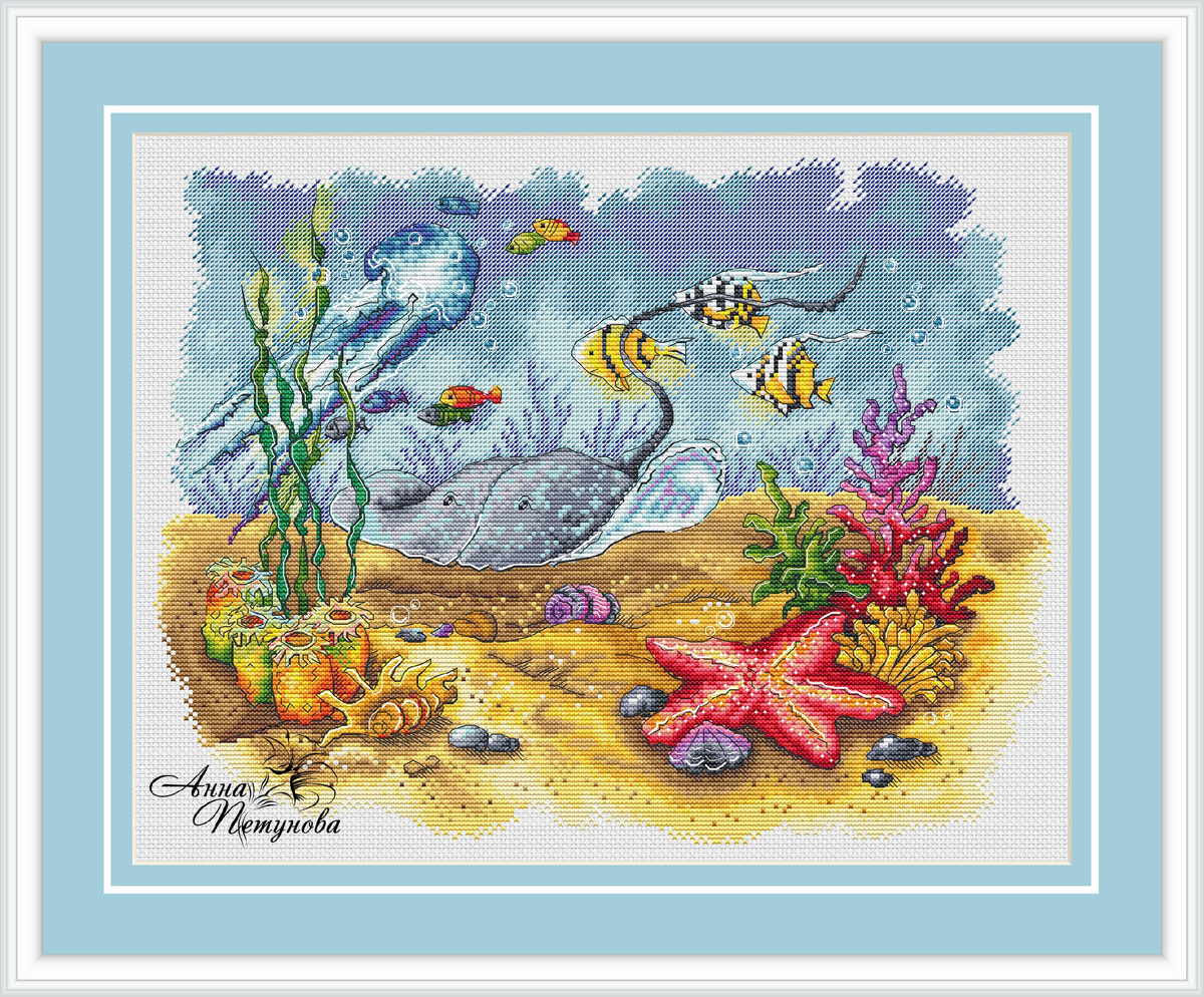 1 января 2024 года в 1 час 10 минут, под грохотание салютов за окном, был начат грандиозный проект по авторской схеме Анны Петуновой "Тайны океана". Характеристики: 204х157 крестиков или 29*22 см. (примерно), нитки DMC - 43 цвета + 9 блендов из них. Крест, полукрест, счетный и дробный бэк, фрузелки, основа - Fein Aida 18 ct., 3793/503 (нежно голубая). Материалы по ключу, покупала в своем любимом "Радуга Вышивки", правда было это в 2020 году. Проект рассчитан примерно на год, весной должна закончится работа над проектом Совинного леса "Звездный дракон" и эта работы займет его место, а бисерные "Олени на водопое" стоят в плане на март. На фото основа почему то серая, хотя она нежно голубая и даже светлые крестики смотрятся чудесно. 1 февраля . На фото результаты работы за январь (будние дни), в дальнейшем эта работа займет места звездного дракона. Канва почему-то кажется серой, хотя она голубенькая.