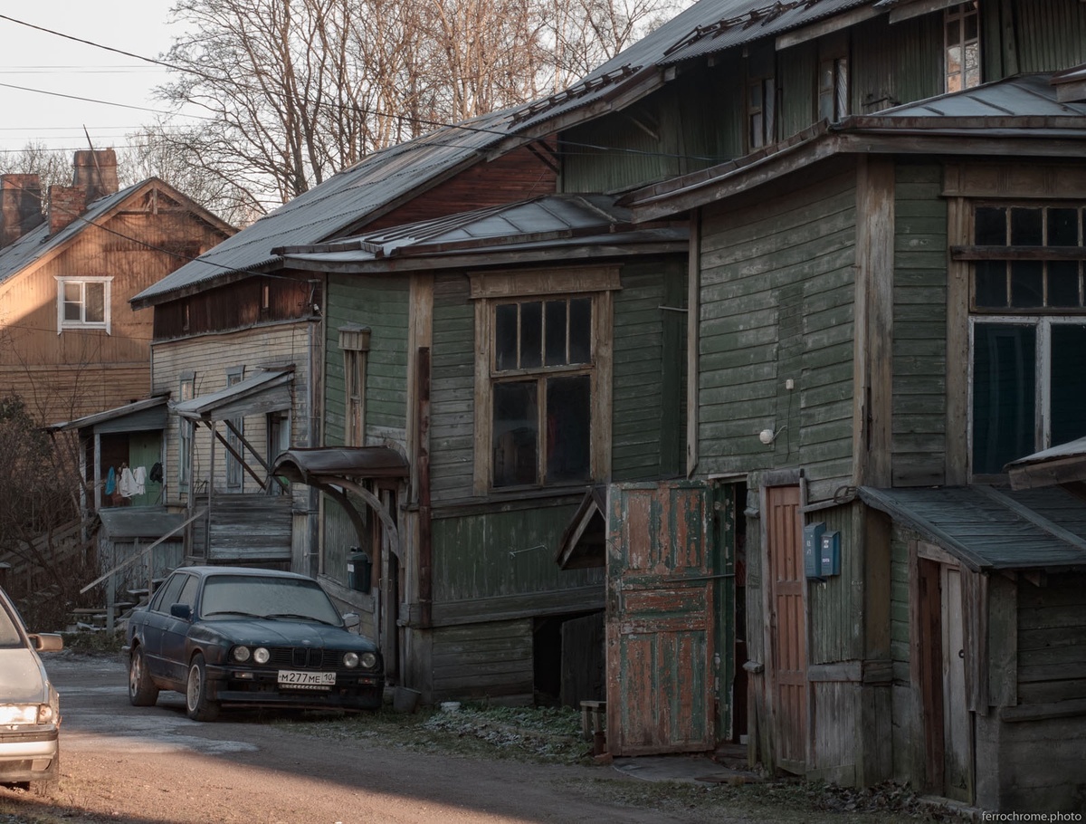 Начнём с примыкающих к центру кварталов. Старинные финские деревянные домики, бывшие когда-то аккуратными и опрятными. Многие из них имеют статус объекта архитектурного наследия. Теперь же катастрофическими темпами становятся аварийными, расселяются по программе и подлежат либо сожжению от неосторожного обращения с огнём, либо официальному сносу.