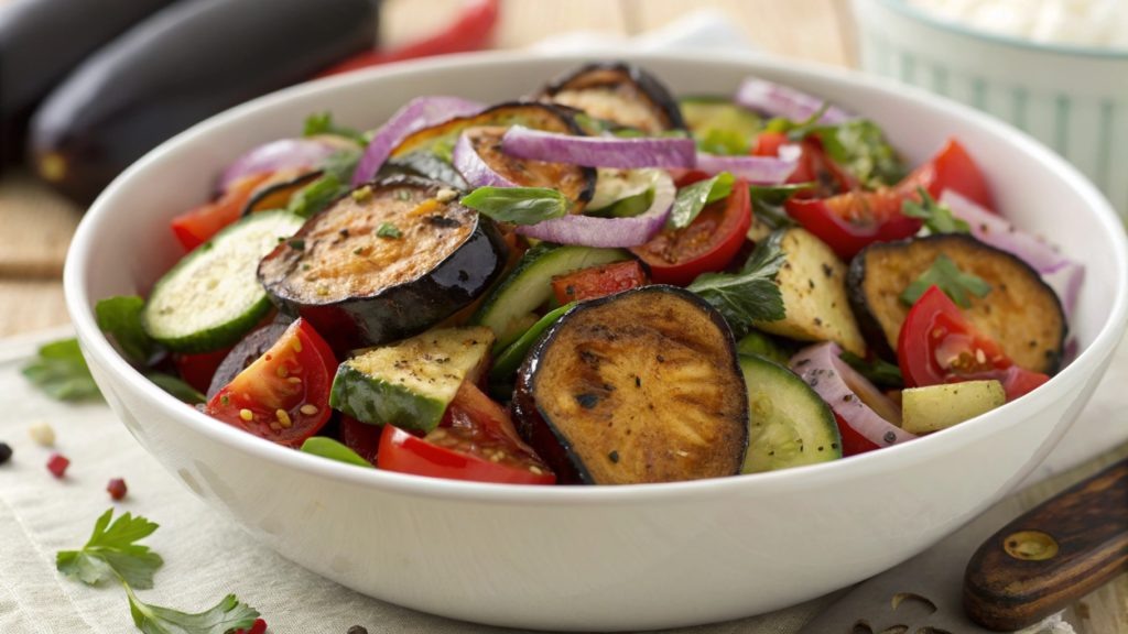 Пикантный салат с баклажанами и томатами – это яркое и нежное блюдо, которое идеально подходит для летних обедов и пикников. Это сочетание свежих овощей и ароматных специй добавляет интересный вкус и делает салат настоящим украшением стола. Баклажаны, обжаренные до золотистой корочки, в сочетании с сочными томатами и зеленью создают невероятный микс текстур и ароматов. Для более яркого вкуса можно добавить немного соевого соуса или бальзамического уксуса.Замените свежую зелень на сушеную, если нет возможности использовать свежую.Салат можно подать с лепешками или хрустящим багетом.Храните готовый салат в холодильнике не более 2-3 дней. Общее время готовки: 45 минут, включая подготовку и ожидание. Данный рецепт рассчитан на 4 порции.