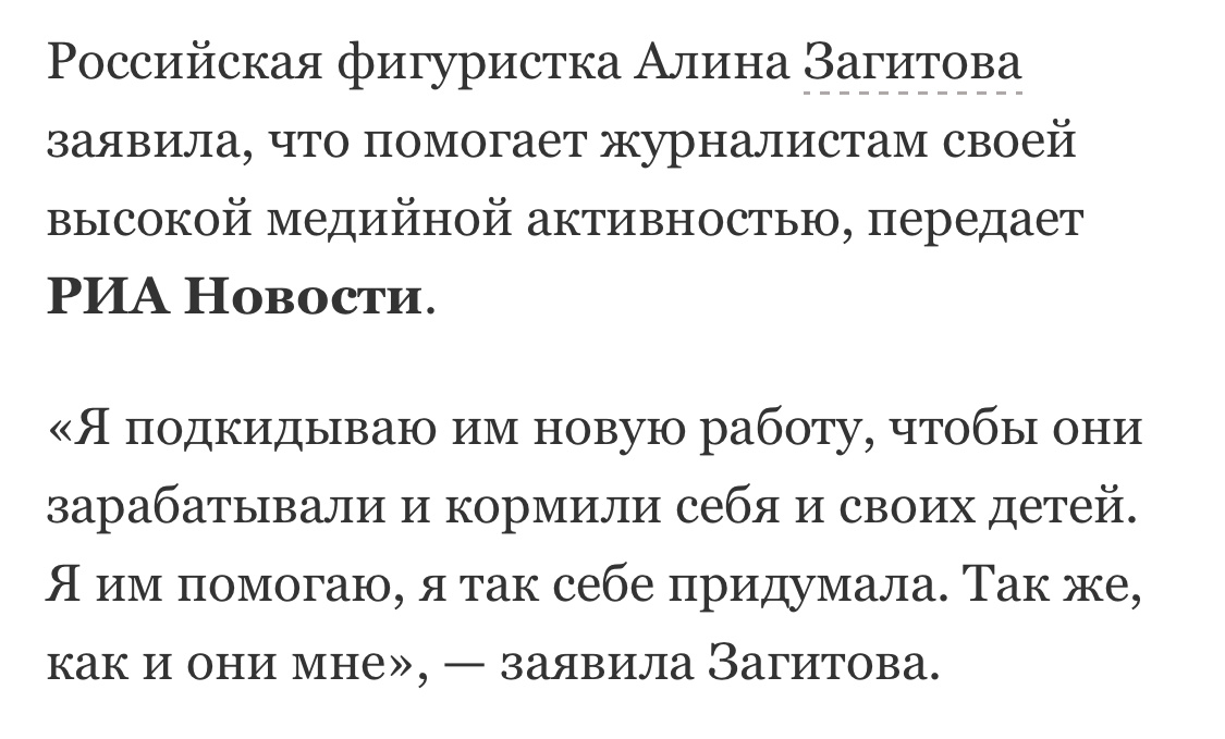 А вообще, если журналисты перестанут освещать Загитову, то она очень быстро ощутит, что никому особо не нужна: «хорошие» статьи зачастую куплены ее командой, а «критикующие» и «хейтерские» статьи пишут именно не купленные журналисты, для которых освещать новости, какими бы они не были, и кто бы не был их «производителем», это тоже работа.