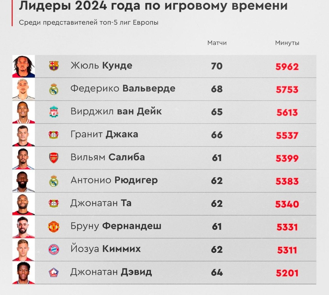 Жюль Кунде – лидер по минутам в 2024-м и по матчам, и по игровым минутам: француз незаменим и в «Барселоне», и в сборной Франции, ни одного матча которых Жюль в этом году не пропустил. Последний раз Кунде просидел матч «Барсы» в запасе в ноябре 2023-го, причем в том же месяце это последний раз произошло и в сборной. Федерико Вальверде мог зарубиться с французом за первое место: в 2024-м он пропустил один матч «Реала», но зато сыграл больше матчей за клуб благодаря победе в ЛЧ. Но, увы, за сборную Феде отбегал меньше, пропустив две июньские товарищеские встречи из-за финала ЛЧ. Гранит Джака (32 года) – самый возрастной в топ-10 после ВВД, тогда как Вильям Салиба (23 года) – самый молодой. P.S. 17-летний Пау Кубарси провел на поле 4649 минут – он в топ не вошел, но стал самым молодым футболистом в истории с таким результатом (у его ровесника, Ламина Ямаля, 4476 минут).