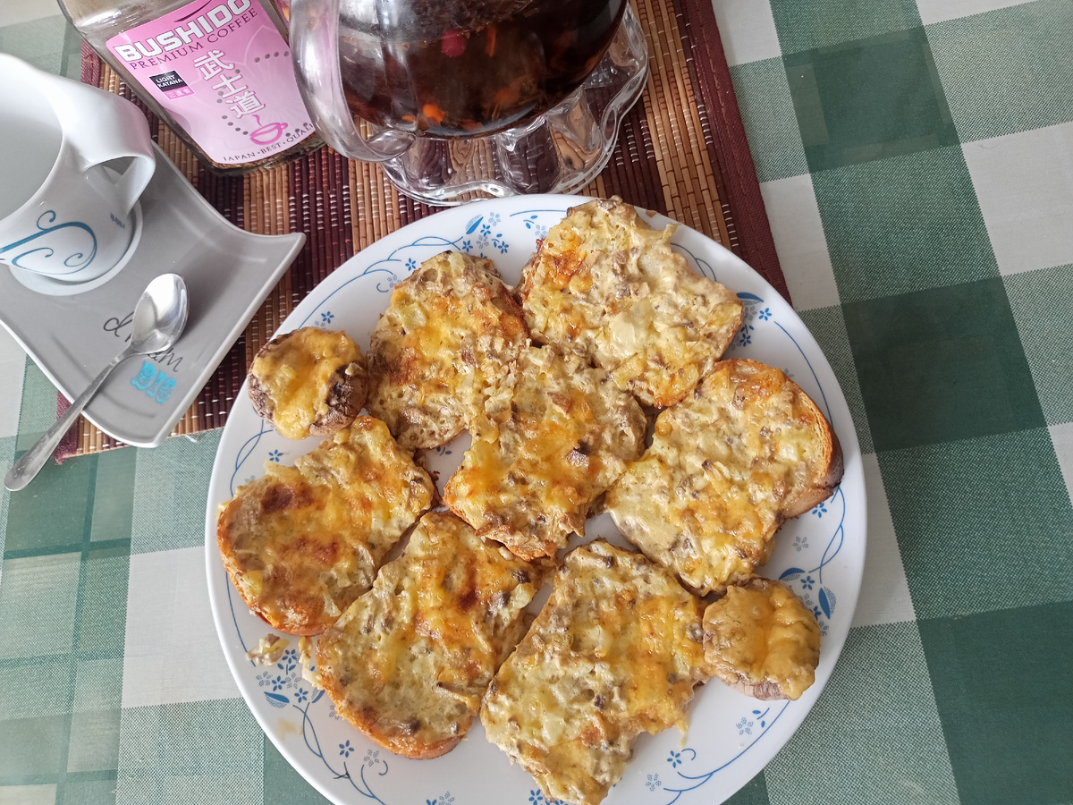 - Каждый ломтик хлеба намазываем начинкой , выкладываем на противень , смазанный сливочным маслом .