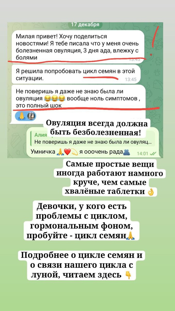 Пмс, изменения формы груди в любое время цикла, боли при овуляции, менструациях или вообще отсутствие месячных или жесточайшие кровотечения - это все не норма!!! Женщина должна жить жизнь и наслаждаться ею, а не зависит от своего цикла с этими всеми непонятными состояниями. Если у вас есть какая то симптоматика из вышеперечисленного , значит определенно вы что то делаете не так... Не так спите, едите, не работаете с детоксикацией печени, не пьете нужные добавки, загоняете себя в стресс и этот список можно продолжать бесконечно... Изначально ищем причину, устраняем ее, паралельно добавляем цикл семян https://t.me/AverinaHappiness/1476 и будет вам и вашим вторым половинам счастье. Если с причинами не получается разобраться, вы знаете к кому обращаться, пишите мне.