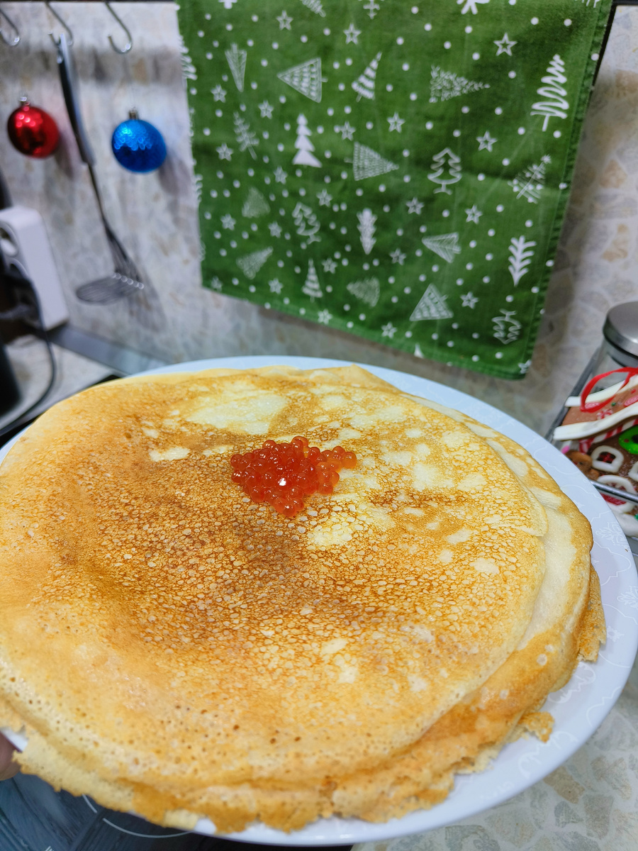 С Новым Годом! Сегодня хочу вам предложить прекрасный вариант позднего завтрака на Новогодние праздники. Пока ваша любимая вторая половинка спит - сделайте ей прекрасный, простой, сытный и очень вкусный завтрак. Время готовки от 40 минут (готовность первого блина) до полутора часов. Ингредиенты : * Молоко 500 грамм (около 2 небольших стаканов) * 3 яйца * Мука 240 грамм * 2-3 ложки сахара ( в зависимости от того с чем вы будете есть блины. Чтобы ничего лишнего не слиплось))) * Большая цепочка соли * Около столовой ложки растительного масла * Вода 100-150 мл * Сливочное масло. Около 50 грамм В идеале все ингредиенты достать из холодильника за час. Но у самого редко получается так сделать , особенно когда готовлю с утра. К счастью, живём в современном мире и есть лайфхаки. Молоко разогрейте в микроволновке, но только не переборщите, чтобы не было горячим. До комнатной температуры. Если у вас есть блендер погружной, то можете не заморачиваться по поводу того как смешивать ингредиенты