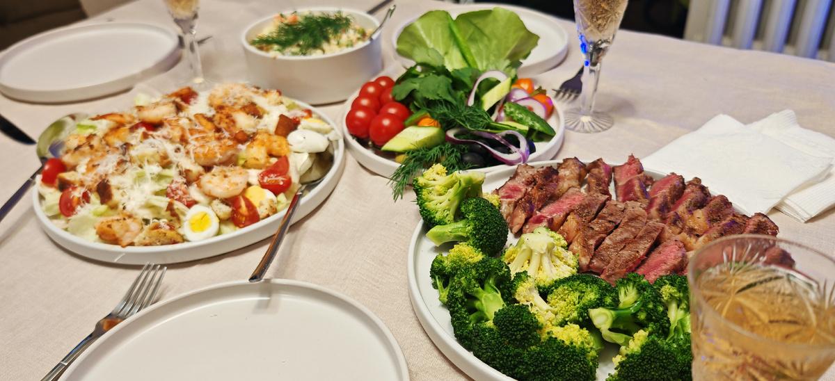 Поздравляю все с наступившим 2025! Пусть он будет лучше, добрее. Пусть у вас не будет никаких потерь и все ладится! Я вступила во вторую четверть века, отметив свое 35-летие. И, кажется, я старею 😂, потому что знаете, что я подарила сама себе ко дню рождения? Новые наборы модной керамической посуды! Не духи, косметику или шмотки, а тарелки с вилками. Эххх Новый год мы отметили вечером 31го числа с мальчиками дома. На столе был традиционный оливье - его любит Захар и цезарь с креветками. Поклонником (и большим) этого салата является Баграт. На горячее пожарила нам стейки -быстро и вкусно. И, конечно, собрала небольшую овощную тарелку. Ужин наш получился не тяжёлым, сытным и праздничным, из новых тарелок же ели😂 Вы бы видели, как я их тащила -везла с пункта выдачи. Не подумала заказать к дому, взяла у хозяина местного магазинчика тачку и катала коробки до подъезда. Ну, тут сработала пословица "дурная голова -ногам (и спине) покоя нет". Вот она наша дружная компания А первого числа я