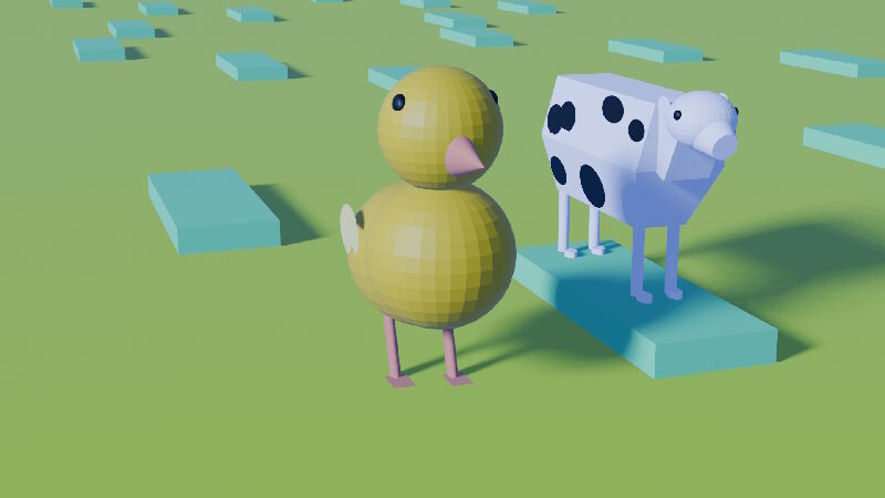 Трехмерная сцена на сегодня по мотивам поля и трехмерных зверят. Добрые зверята уже ждут тебя в поле. Летом на даче! Они сейчас тоже праздную новый год! Вот коровка весело махает хвостиком и говорит – “Муууу!!!”. И улыбается. Утенок прибежал в поле. Крылышками махает. И прыгает! Утенок любит бегать и прыгать! А еще новый год в поле. Тут такое лето.