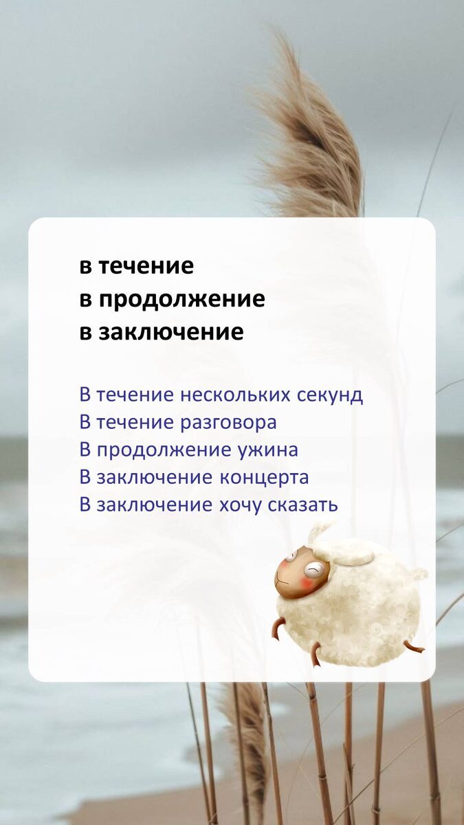 Сегодня на нашей сцене великолепная тройка: в течение в продолжение в заключение Своим ученикам даю их именно в такой связке и говорю, что они пишутся именно так и не иначе. Каждое слово из этих трех вызывает свои трудности. Предлог В ТЕЧЕНИЕ имеет мощный бэкграунд в виде правила, о существовании которого все помнят. Но ни к чему хорошему обычно это знание не приводит. В голове начинает крутиться: раз есть правило, значит, что-то с этим словом не так, поэтому давайте напишем его слитно. Слава богам, на егэ хотя бы конечную гласную в этом слове не проверяют, а то еще и с ней бы грешили. В ПРОДОЛЖЕНИЕ норовят написать слитно. Почему - не знаю. Тоже почему-то видят в этом слове подвох. В ЗАКЛЮЧЕНИЕ пишут раздельно (ура!). Но в собственных сочинениях частенько пишут И на конце. Я советую просто запомнить эту троицу, без попыток что-то себе объяснять. Дело в том, что в подавляющем большинстве случаев мы используем эти конструкции по их прямому назначению, то есть как предлоги. В ТЕЧЕНИЕ, В