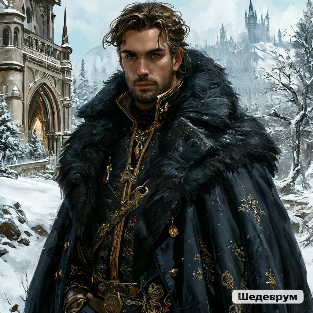 Высокий, широкоплечий в черном меховом плаще, с непокрытой головой. На угольно-черных волосах, стянутых в хвостик, поблескивал иней. Из-под плаща виднелся кончик шпаги, на груди переливался изумрудный медальон с гербом его дома. Благородное лицо, высокий лоб, волевой подбородок, на котором не было и намека на щетину.