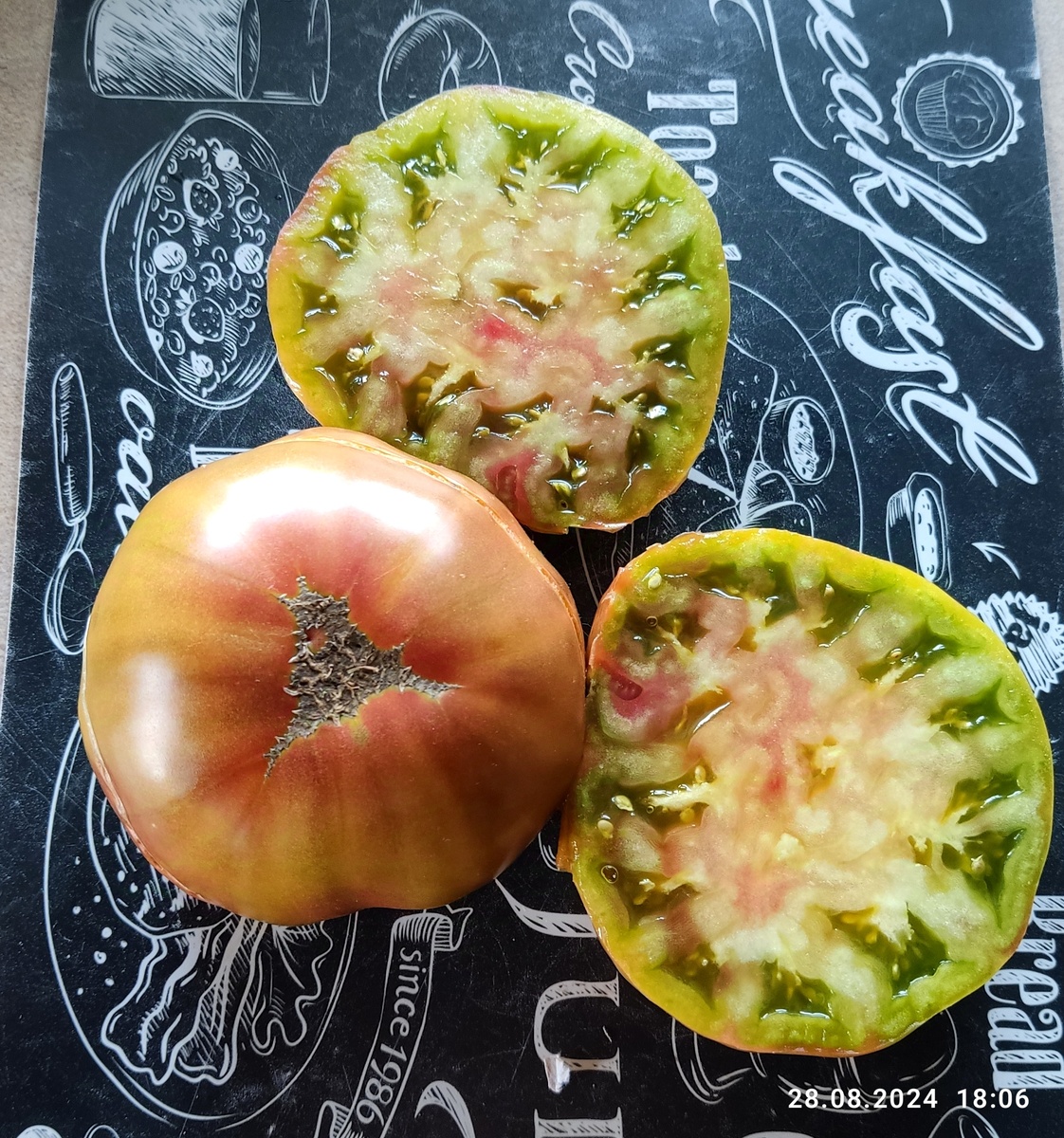 Кленовый сироп, или как его еще называют Le SiropD’erable, был получен путем переопыления сорта Сладкий Горизонт и еще одного неизвестного вида. Родиной считается Франция. Хотя он был выведен довольно давно, сейчас мало кто вообще знает о его существовании. Меня, конечно же, соблазнило название. Я очень люблю кленовый сироп, настоящий только, а не его имитацию. Если вы пробовали его, то прекрасно сможете представить вкус этого томата! Эта небольшая терпкость во вкусе очень созвучна с кленовым сиропом. В моём случае томат не успел набрать сахара́, созревание попало как раз на тропические ливни 2024 года... Очень жаль. Да и вообще, у нас с ним не очень сложилось. Уж больно чувствительный он оказался. С самой высадки начал капризничать. Этот томат индетерминантный, поэтому рос у меня в теплице. Каждый год в теплице у меня жируют томаты. Почему, пока так и не разобралась. Происходит это в начале июня как правило, потом всё нормализуется. Методом исключения есть вариант, что это от жары,