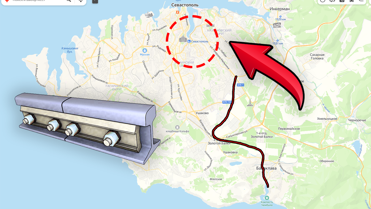 В 1855 году, в разгар Крымской войны, англичане построили прямо на нашей оккупированной территории железную дорогу, которая сыграла важную роль в осаде Севастополя. Материалы для верхнего строения пути и паровозы были доставлены из Англии. За семь недель было уложено 11 километров путей. Ниже вы можете увидеть, как проходила данная дорога в Крыму.