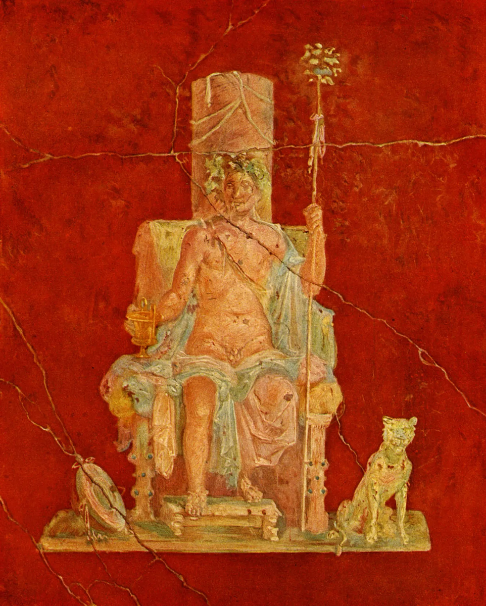 Дионис, сидящий на троне. Фрагмент фрески на вилле Мистерий в Помпеях. Вилла была основана во II веке до н. э. и пережила извержение Везувия в 79 году