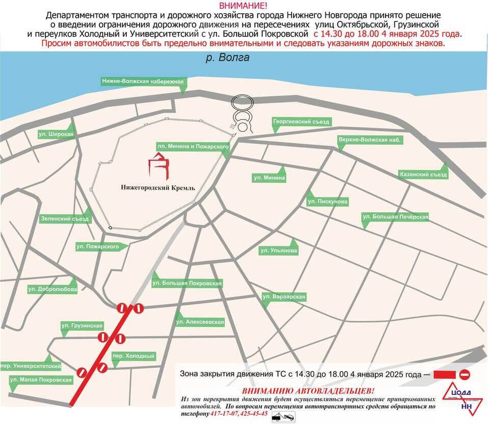 4 января 2025 г. в Нижнем Новгороде будет прекращено движение транспорта по улицам Октябрьской, Грузинской, а также по переулкам Холодному и Университетскому на пересечениях с улицей Большой Покровской из-за проведения фестиваля «Горьковская елка 2024-2025». По данным городского департамента транспорта, ограничение будет действовать в период с 14:30 до 18:00. Объехать зону проведения мероприятия получится по прилегающим участкам улично-дорожной сети. NN.DK.RU писал также, что при возникновении заторов в Нижнем Новгороде до 23:59 4 января 2025 г. запрещен проезд по улице Совнаркомовской — по участку от улицы Керченской до улицы Мурашкинской.