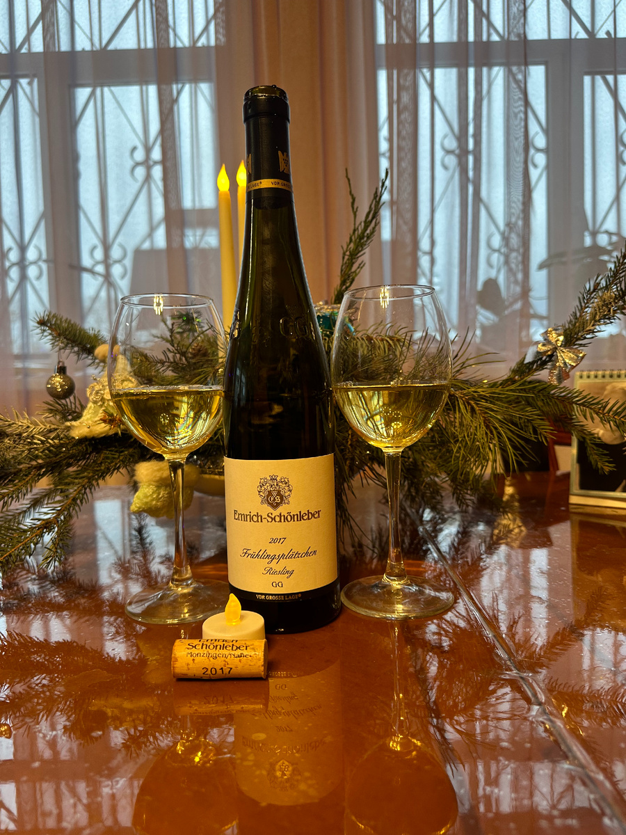 Хороший немецкий Рислинг, для меня это лучшее начало нового года. Не скрою, что я поклонник рислинга в целом и немецкого в частности. Насколько сомнительно у немцев красное вино, настолько великолепен Рислинг. Сегодня у меня на столе вино Emrich-Schonleber, "Fruhlingsplatzchen" Riesling GG, 2017 от винодельни Emrich-Schonleber, регион Наэ. История хозяйства уходит корнями в середину восемнадцатого века. Первое упоминание о виноделии в нашей семье относится к середине XVIII века и содержится в завещаниях Эмрихов. Упоминания о винах этой семьи то и дело встречались в исторических документах. В 1991 году хозяйство попало в список 100 лучших виноделен Германии, а в 1994 году стало членом VDP. Сегодня семья Шеленберов обрабатываем 20 гектаров виноградников. В настоящее время 85% виноградников засажены сортом Рислинг, а также сортами Грюнер Вельтлинер (Пино Гри) и Вайсбургундер (Пино Блан). Вино, которое я сегодня дегустирую, сделано из Рислинга с виноградника "Fruhlingsplatzchen". Виноград