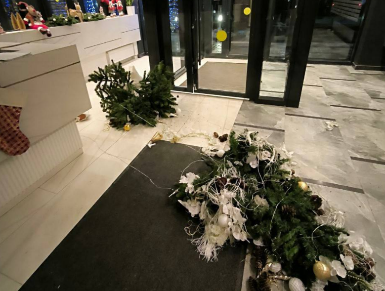 Первой жертвой богобоязненного бойца стала праздничная ёлка, гордо стоявшая в подъезде. Соседи вспоминают, что её украшали самодельные игрушки детей, гирлянды и мишура.
