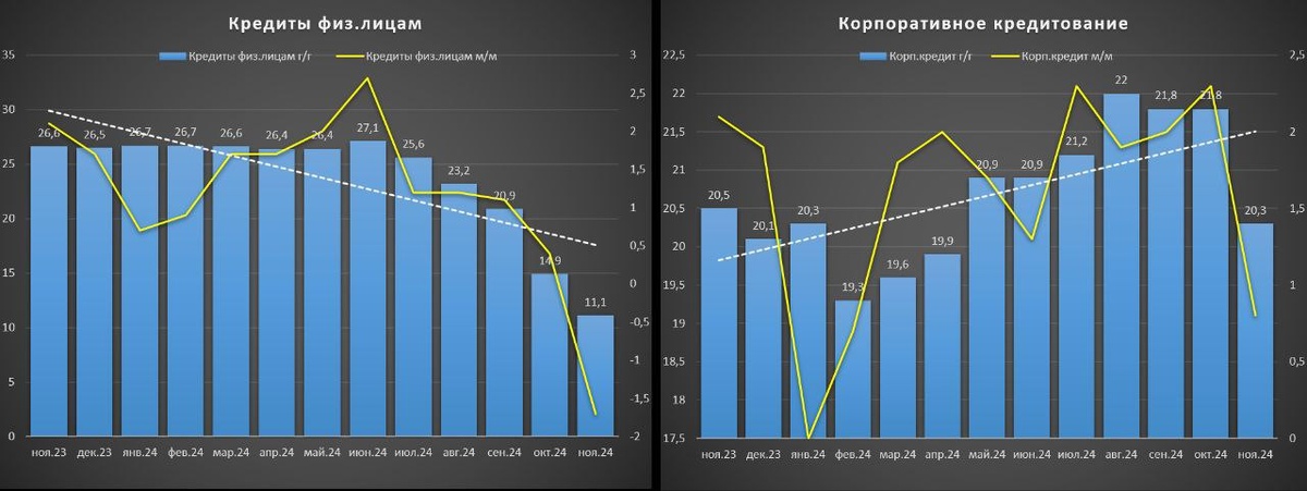 Итак, похоже на то, что выдача кредитов окончательно развернулась вниз. Последний оплот преткновения в виде корпоративных кредитов перешел в цикл замедления: в сравнении с прошлым годом +20,3% ноябрь 2024 г.vs +20,5% ноябрь 2023 г., месяц к месяцу +0,8% ноябрь vs +2,3% октябрь. Выдача кредитов физ.лицам с конца лета устойчиво смотрит вниз: год к году +11,1% ноябрь 2024 г. vs +26,6% ноябрь 2023 г., месяц к месяцу -1,7% ноябрь vs 0,4% октябрь. Ипотека замедляется быстрее всех: +16,4% ноябрь 2024 г. vs +34,9%. Далее идут потреб.кредиты, а в автокредитовании замедление только начинается. Это хорошая новость для ЦБ в борьбе с разгоном цен. Опросы бизнеса по продажам и новым заказам в декабре подтверждают снижение спроса на товары/услуги. В опросе участвуют свыше 10 000 предприятий, значения отображены в формате индекса. Итак, в декабре динамика индекса спроса уверенно погружается вниз: -3 п. декабрь 2024 г. vs 1,4 п. декабрь 2023 г. Падение продолжается уже 4 –ый месяц подряд. Опросные д