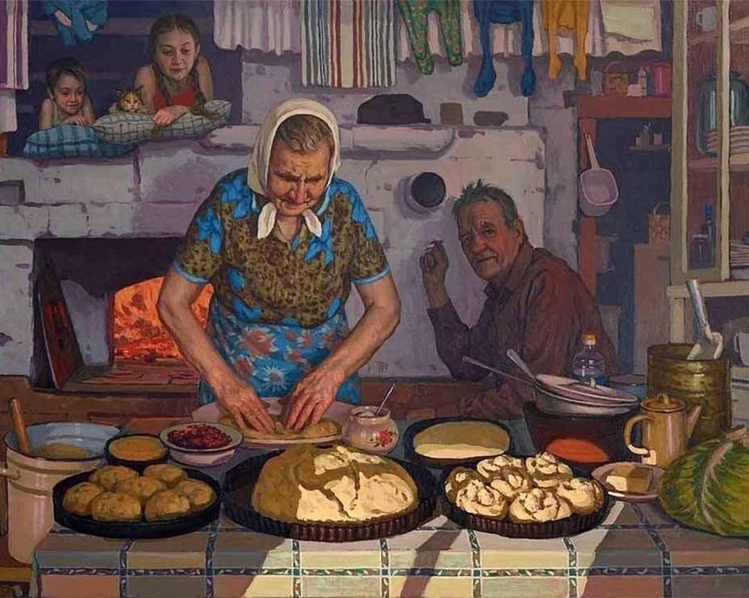 Какая теплая, уютная картина! Сколько в ней доброты и душевности! И в то же время – простоты и скромности. Никто из персонажей ничего из себя не строит, никто не стремится к самореализации, никто не хочет показать себя миру, никто не стремится достичь каких-то запредельных высот. И при этом все счастливы, и всем хорошо. Котик такой смешной между ребятишками на печке пригрелся.