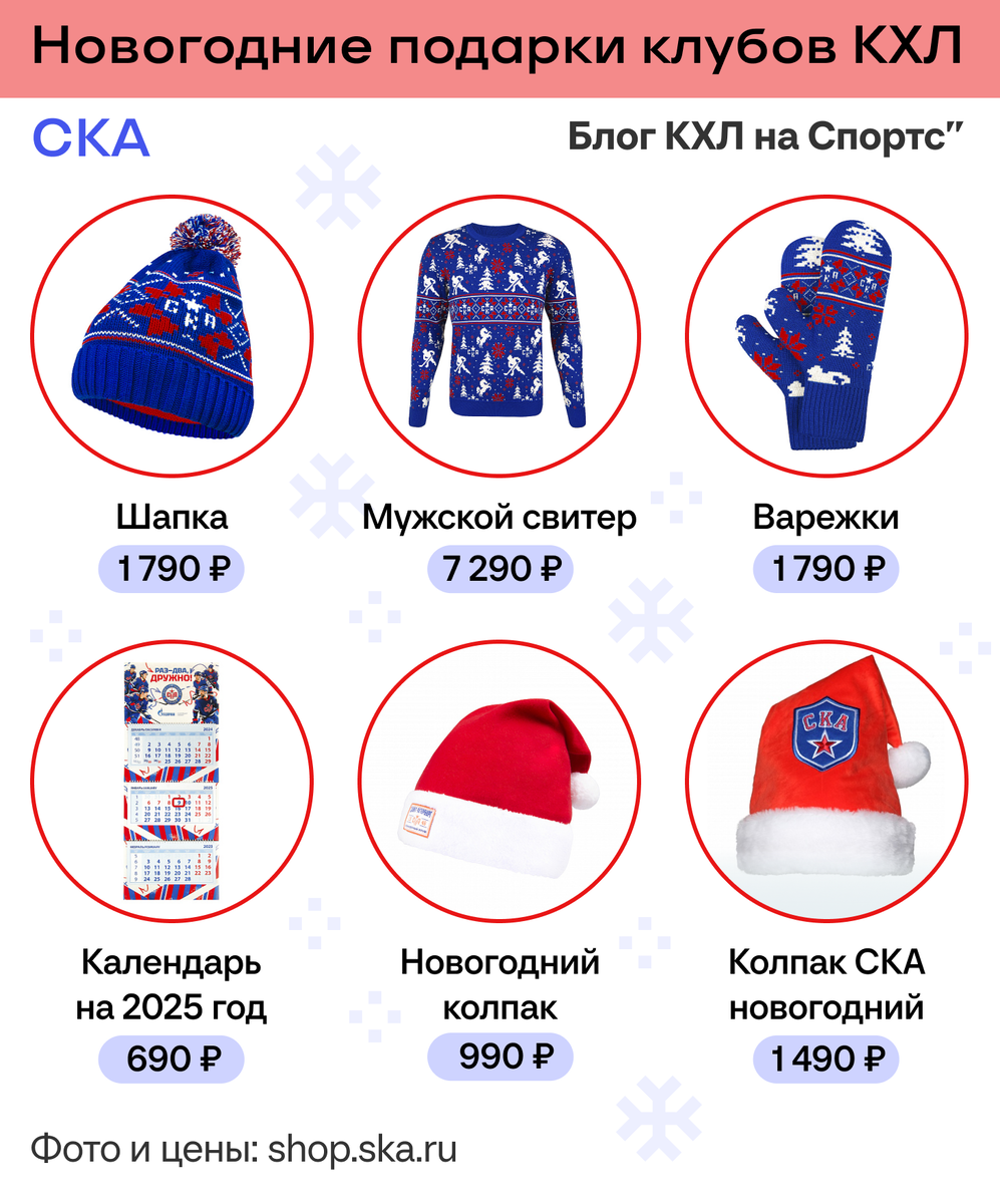Петербуржцы презентовали целый комплект одежды на новогоднюю тематику: шапку, варежки и свитер в клубных красно-синих цветах. На них изображены елки, фигуры хоккеистов, кони (Конь-Огонь – талисман клуба), снежинки разных размеров и сам логотип СКА. Все три позиции обойдутся болельщику в 10 870 рублей. Также из новогодней коллекции в фан-шопе доступны настенный календарь, новогодний колпак и елочный шарик.
