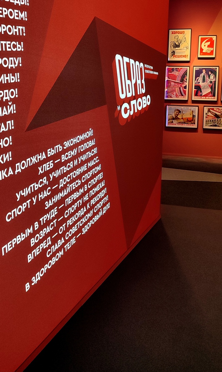 Экспозиция. Пространство на удивление небольшое, выстроено замысловатым коридором и поделено на пять тематических зон - "Демиурги страны", "Товарищ женщина", "Мужество и победа", "Порок за порог" и "Спорт". Архитектурный образ проекта создан в стилистике конструктивизма и вдохновлен образами работ, которые представляла наша страна на международных выставках в 1920-е - 1930-е годы. Ожидал, что плакатов будет больше и этикетки к ним смогут раскрыть смыслы. Увы. Возможно на ожидание повлияла выставка советских плакатов, увиденная мною ранее, в центре "Зотов".