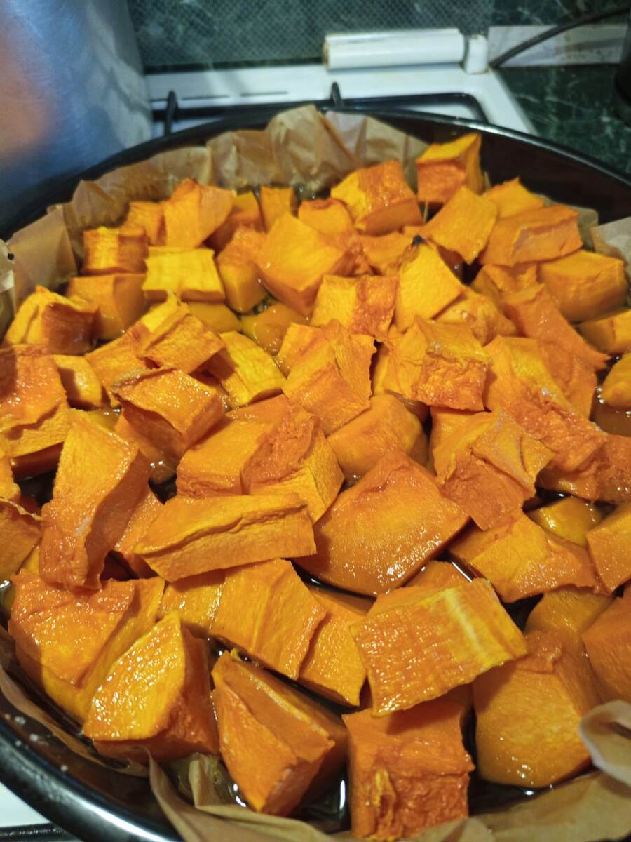 Очистите тыкву от кожуры, нарежьте крупными кубиками — не меньше 5х5 см и выложите их на противень, предварительно застелив дно пергаментом (бумагой) для запекания. Обильно засыпьте сахаром.