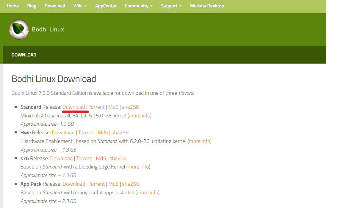 Скачать дистрибутив Bodhi Linux можно с официального сайта по ссылке. Ниже на скриншоте я отметил ссылку на этот базовый дистриб.