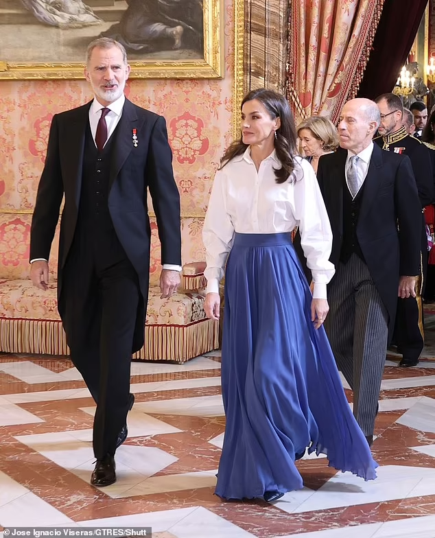 Новости об испанских королях. Король Филипп и королева Летиция устроили новогодний приём для дипломатического корпуса. Летиция выбрала белую блузку-рубашку и длинную синюю атласную юбку, из украшений - бриллиантовые серьги. Приём обычно проходит в Новый год, который пара устраивает ежегодно с тех пор, как король Филипп взошёл на престол в 2014 году. Королевский дворец в Мадриде, где проходило мероприятие, является официальной резиденцией испанской королевской семьи, но в настоящее время используется почти исключительно для государственных церемоний. А в это время принцесса Леонор приступила к тренировкам на учебном корабле. Очень скоро принцесса отправится в учебный круиз, где ей понадобится показать свои навыки работы на корабле.