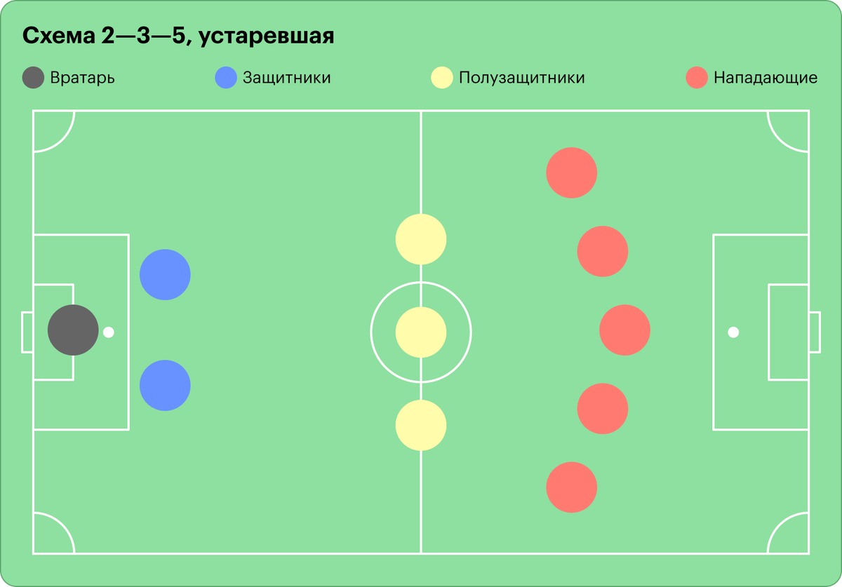 Первые футбольные команды использовали схему 1-1-8, где акцент делался на атаке. Задача защитников заключалась исключительно в разрушении атак соперника.