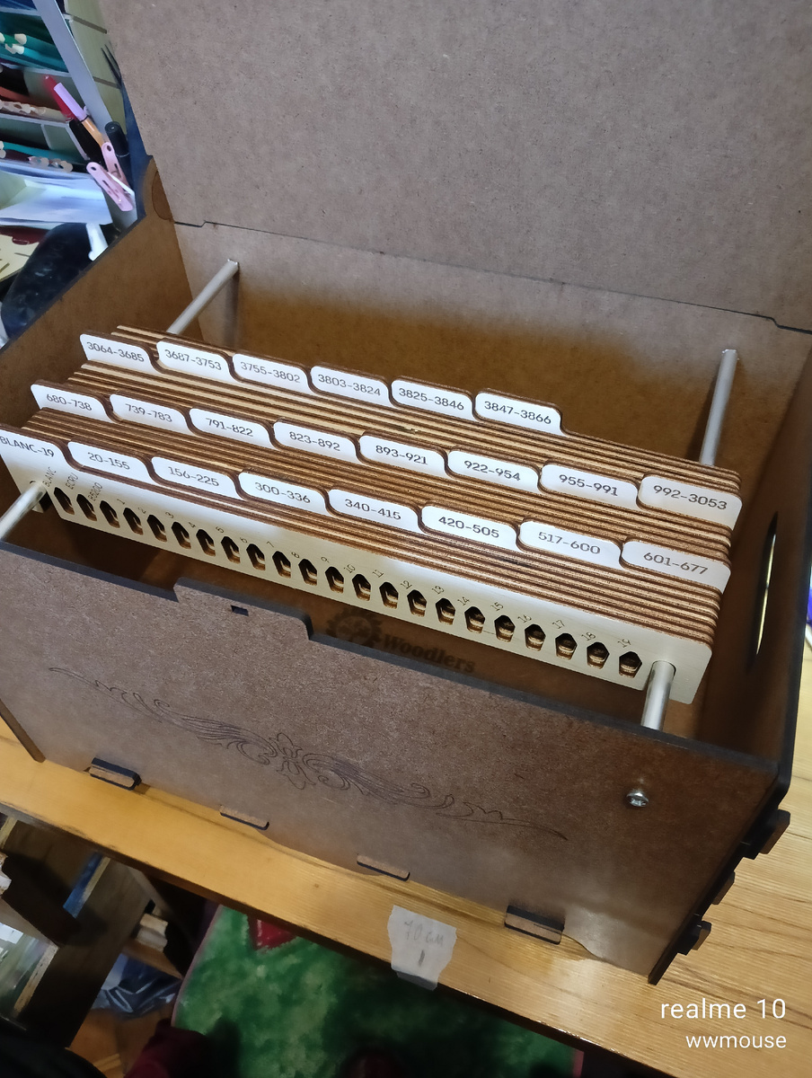 Наступил и у меня такой момент. А потом ещё раз наступил. И ещё. И ещё раз. Купленные нитки надо было рационально складывать, чтобы поиск нового цвета для вышивания не превращался в непреодолимый квест. На тот момент мне показалось удобным перемотать на бобинки, подписать номера и разложить по коробкам, на которых были тоже номера. Коробок вышло 14....