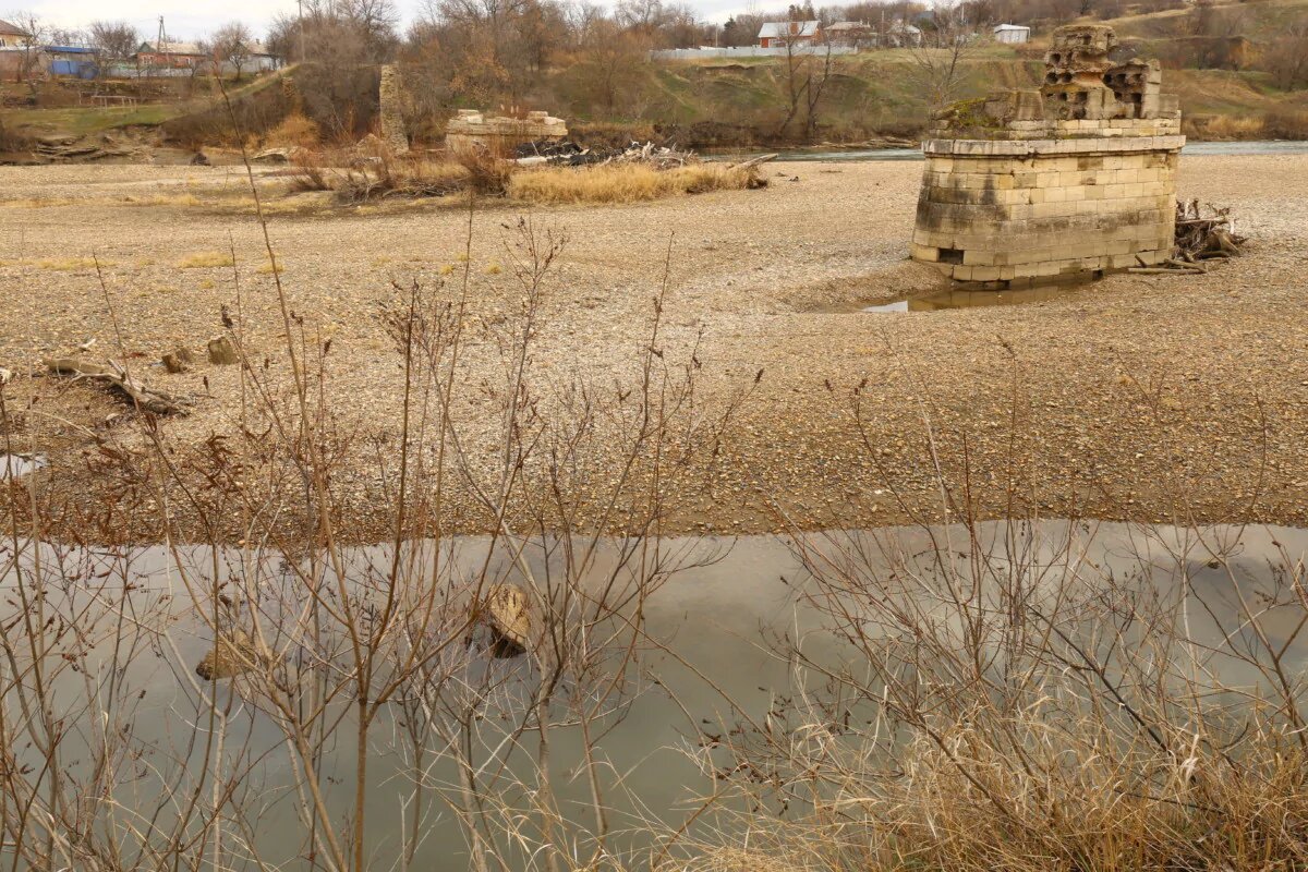 Оставляем машину и спускаемся к воде. Идём по левому низменному берегу реки, почти напротив старинной казачьей станицы Прочноокопской. Над быстрым течением Кубани прежде высился красивый мост, возведенный в 1904-1906 гг. Сейчас увидите лишь его руины. Быки, некогда служившие опорой железным фермам, остались от еще более раннего деревянного моста, построенного в 1854 г. Они напоминают крепостные неприступные башни, стоящие на каменной насыпи. Если сравнить с ландшафтом со старинной открытки, можно прийти к печальному выводу – река сильно обмелела. Так что мы фактически оказываемся на дне пересохшей Кубани, приближаясь к подножию былой переправы. Здесь, у быков, мороз трогает хрустким льдом воду, то ли собравшуюся от осадков в лужи, то ли просочившуюся от бурного потока, бегущего со стороны Прочноокопской.