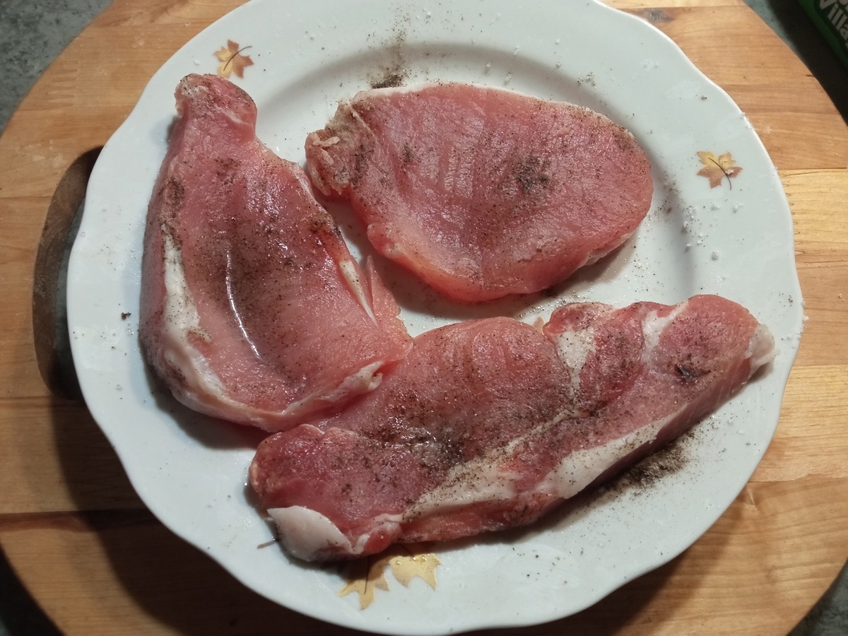 Довольно часто я готовлю именно такой ужин. Не всегда он обходится в 200 рублей. Иногда еще дешевле, рублей в 100. :) Но об этом ниже. Итак, основа ужина - три куска свинины. Весят они вместе 300 г. Мясо я покупала по 300 р. за кило, итого - на этот ужин чуть больше 100 рублей. Кстати, именно покупка сырого мяса, а не полуфабрикатов всегда обходится намного дешевле, хотя некоторые думают по-другому. При покупке мы обычно быстро разделываем мясо на порционные куски и замораживаем. Можно потом достать с утра мясо и положить оттаивать до вечера. А можно просто разморозить за минуту в микроволновке прямо перед приготовлением. Потом посолить, поперчить мясо и хорошо разогреть сковородку. Конечно, чем дольше мясо полежит в соли и перце, тем мягче оно будет, так что при возможности постарайтесь его помариновать. Но на самом деле, можно и сразу жарить. Сначала пару минут с одной стороны, потом пару минут - с другой. Я в процессе еще добавила дольку чеснока в масло для вкуса. Потом надо ещ
