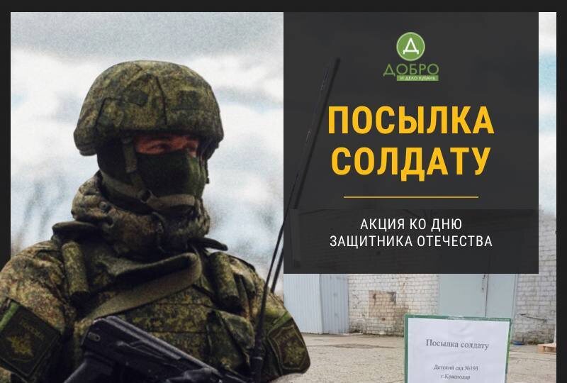Фонд «Добро и Дело» запустил акцию «Посылка солдату», направленную на поддержку российских военнослужащих. Она приурочена ко Дню защитника Отечества. В посылки можно положить как необходимые в быту вещи, так и символические подарки: Организаторы акции рекомендуют собирать посылки весом до 3–5 кг, поскольку это удобно для транспортировки. Коробки нужно подписать и красиво оформить. Посылки принимают в пунктах сбора по следующим адресам: Акция продлится до 12 февраля. Все собранные посылки будут переданы лично в подразделения солдат. Организаторы акции «Посылка солдату» отмечают, что главная цель — это укрепление семейных, духовно-нравственных ценностей, воспитание патриотизма, уважения и гордости за наших солдат и Родину. Социальная реклама, 18+.