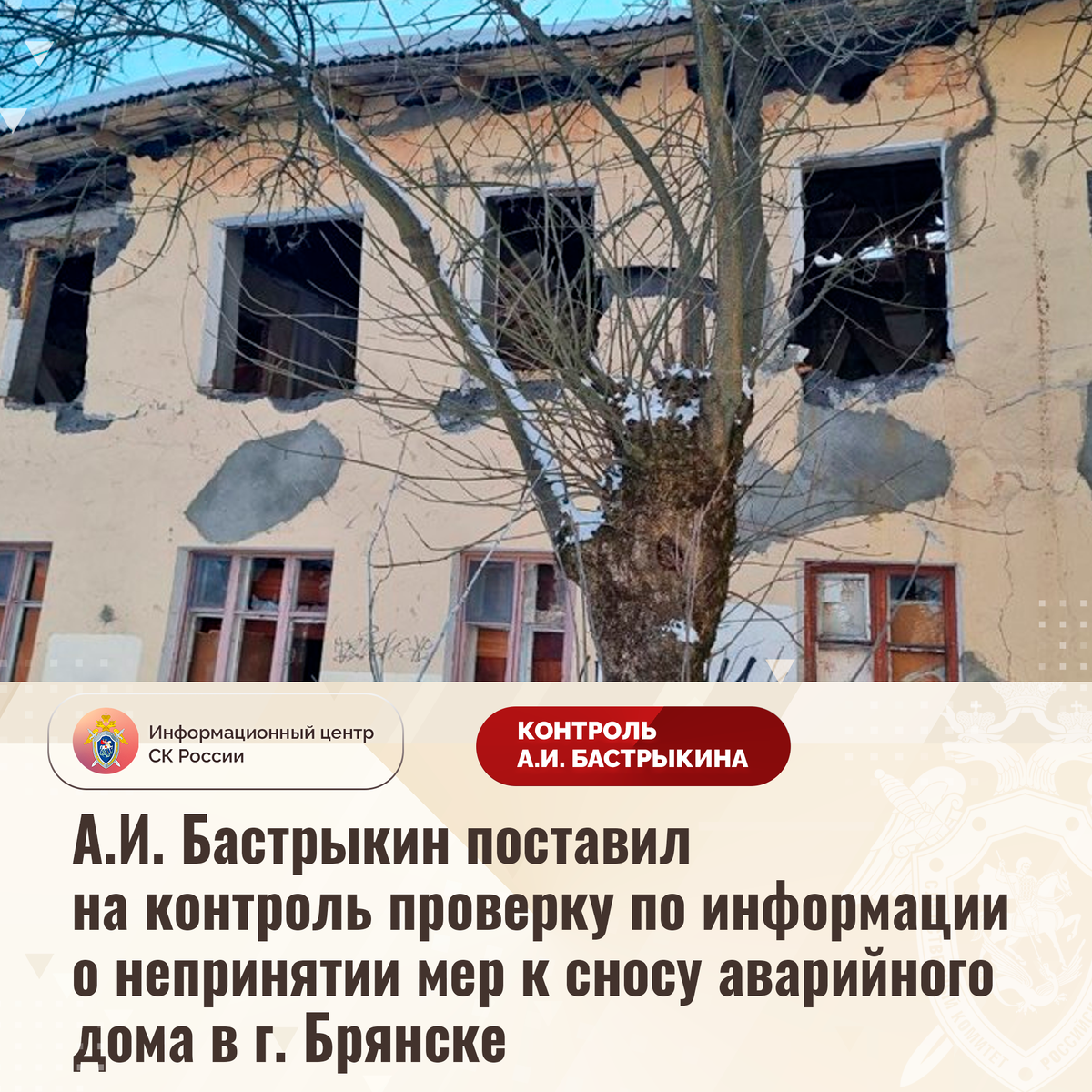 А.И. Бастрыкин поставил на контроль проверку по информации о непринятии мер к сносу аварийного дома в г. Брянске Внимание Председателя СК России А.И. Бастрыкина обращено на публикации в СМИ и социальной сети о длительном непринятии мер к сносу аварийного дома по улице 3-го Июля в городе Брянске. Длительное время фасад и кровля ветхого и ранее расселенного здания разрушаются, на его стенах образовались трещины, конструкции накренились в сторону пешеходной зоны, в связи с чем имеется угроза обрушения кирпичной кладки и травмирования граждан. Многочисленные обращения в компетентные органы результатов не принесли. В СУ СК России по Брянской области по данному факту организована процессуальная проверка. Председатель Следственного комитета Российской Федерации Александр Иванович Бастрыкин поставил ход процессуальной проверки на контроль в центральном аппарате ведомства и поручил и.о. руководителя СУ СК России по Брянской области Сергею Анатольевичу Старову доложить о ее предварительных и око