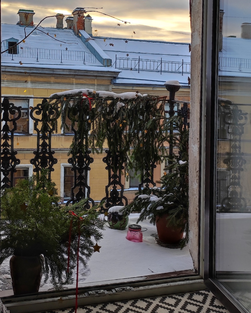 Обычно зимой я оставляю на балконе ящики с увядшими растениями до весны, вдруг что-то посеется (гипсофила и анютины глазки у меня всходили самосевом) или перезимует (вербейник монетчатый один раз выжил). Но поскольку в этот раз мой балконный сад завял уже в июле из-за безолаберности долгих поездок на дачу, впервые решила украсить его еловыми ветками. Одну ветку привязали к перилам, а из другой получилась небольшая елочка в горшке. У нас в СПб снег выпал как раз 31 декабря и получилась вот такая новогодняя красота. Многие знакомые считают, что балкон в нашем климате нужен только летом. У нас в квартире зимой кресло у балкона - любимое место, чаще всех его занимает кот. И елку мы поставили рядом с балконом. И для балконной елочки и для домашней вместе с детьми сделали звезды и фигурки из фольги, гирлянду из пайеток и проволоки. И еще повесили на елку пряники, которые тоже расписывали сами глазурью. Пряники семья есть отказалась. Сказали, что жалко. А вот тортик в виде нашей деревни