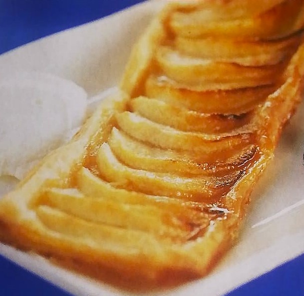 Ингредиенты: - ½ упаковки слоеного теста - 2 очищенных яблока - 4 ч. л. сахара - 20 г сливочного масла - 75 мл сливок - панировочные сухари Приготовление: Раскатайте слоёное тесто тонким слоем и порежьте его на одинаковые полосы. Яблоки разделите пополам, вырежьте середину и нарежьте их тонкими ломтиками. Выложите яблоки «лесенкой» на тестяные полоски, посыпьте их сахаром и добавьте небольшие кусочки сливочного масла. Смажьте противень сливочным маслом и слегка обсыпьте его панировочными сухарями. Разместите получившиеся «санки» на противне и запекайте до тех пор, пока яблоки не станут мягкими, а сахар не превратится в карамель. Подаётся блюдо с взбитыми сливками.