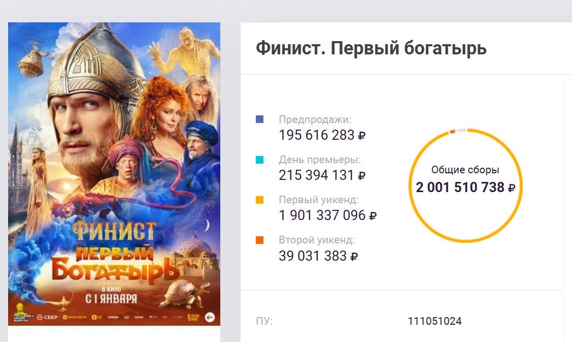 Сказка преодолела знаковую отметку вслед за фэнтези-блокбастером «Волшебник Изумрудного города. Дорога из желтого кирпича». На данный момент сборы картины Игоря Волошина превысили 2,6 млрд рублей. В клубе миллиардеров также оказались «Елки 11», заработавшие 1,1 млрд. Главные роли в спин-оффе «Последнего богатыря», посвященном приключениям Финиста Ясного Сокола, исполнили Кирилл Зайцев, Юлия Пересильд, Елена Яковлева, Федор Добронравов и Сергей Лавыгин.
