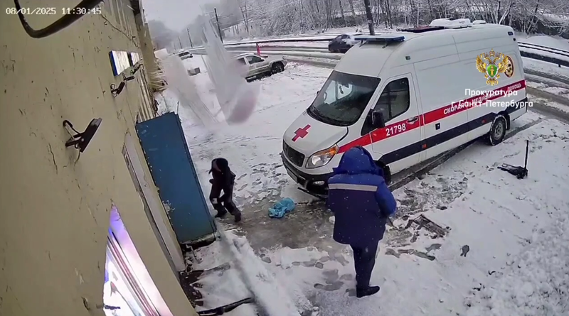 Момент падения наледи на голову сотрудника шиномонтажа попал на видео. Досталось и водителю скорой