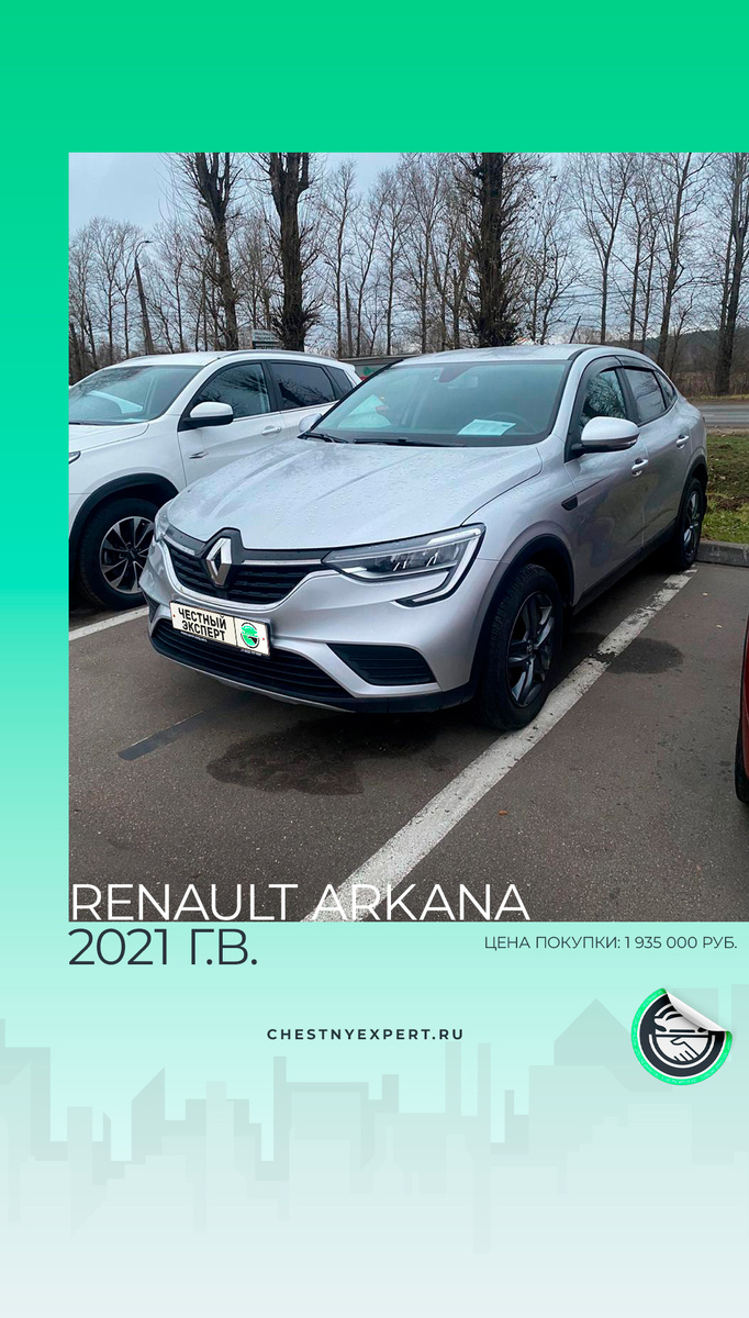Следующей на очереди оказалась Arkana 2021 года. В процессе проверки выяснилось участие автомобиля в крупном ДТП, из-за чего вариант был отклонен. Расширив географию поиска, мы быстро нашли подходящий автомобиль в Твери — Renault Arkana 2021 года выпуск