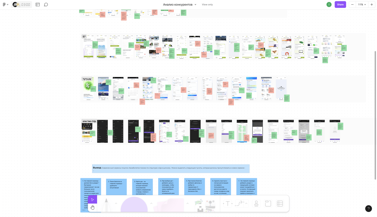 Результатом анализа удобнее оформить в FigJam или Miro. Нужно добавить скриншоты всех основных экранов, а лучше полноценный сценарий, и к каждому добавить небольшие пометки, если какие-либо интерфейсные идеи вам показались интересными. Или, наоборот, неудобными.