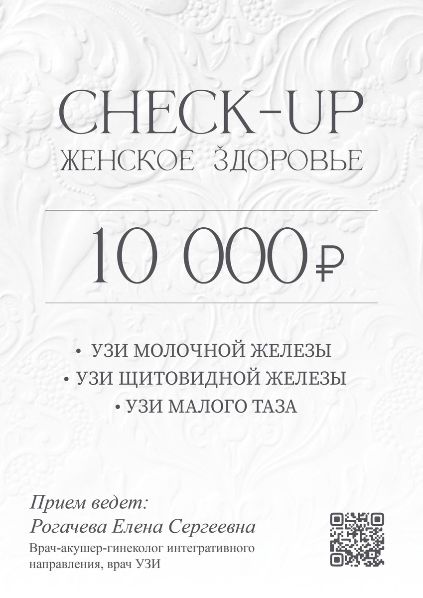 А вы знали, что...многие женские заболевания на ранних стадиях протекают бессимптомно? Именно поэтому так важно регулярно проходить обследования. Наша клиника подготовила для вас особенное предложение: СHECK-UP ЖЕНСКОЕ ЗДОРОВЬЕ В него входят обязательные обследования для девушек и женщин любого возраста: • УЗИ молочной железы - для своевременного выявления возможных патологий • УЗИ щитовидной железы - для контроля гормонального баланса и общего состояния • УЗИ органов малого таза - для оценки репродуктивного здоровья и выявления возможных проблем Комплексный ЖЕНСКИЙ СHECK-UP у опытного врача-гинеколога интегративного направления, врача УЗИ - Рогачевой Елены Сергеевны за 10 000 рублей (вместо 14 500 рублей) Врач проведет тщательное обследование, ответит на все ваши вопросы, даст необходимые рекомендации и назначения. Не откладывайте заботу о себе. Доверьте решение деликатных женских проблем профессиональным специалистам. Предложение действует до 16.04.2025 года