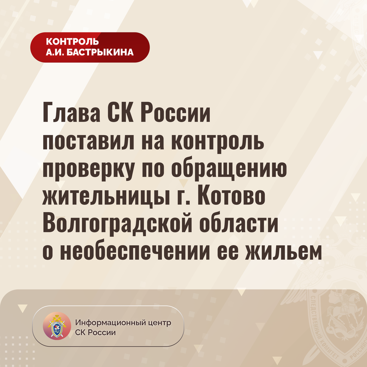 Глава СК России поставил на контроль проверку по обращению жительницы г. Котово Волгоградской области о необеспечении ее жильем