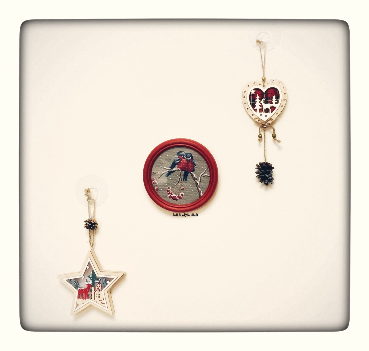 Зимой далекого 2021 года вышилась парочка снегирей (набор «Вместе теплее» от Klart). Эти милые птахи и правда дали ощущение тепла и уюта, вот уж действительно, «вместе теплее». В тот момент как-то не придумалось оформление, поэтому 3 года малыши висели на стене моего дома, будучи просто натянуты на подходящие по цвету пяльцы. Почему-то сохранилось лишь одно фото того времени. В конце 2024 года, при украшении в очередной раз дома к Новому году, неожиданно появилось желание оформить снегирей в круглую раму. Вспомнила, что в шкафу с незапамятных времен лежит маленькая деревянная рамка. Она была куплена лет 20 назад и тогда же самостоятельно обработана морилкой. Изначально в нее была оформлена одна из моих первых вышивок – пингвины из журнала «Валя-Валентина». Теперь же захотелось ее покрасить яркой акриловой краской, что и было сделано. Так скромная рамочка приняла нарядный вид, а снегирьки обрели, наконец, свой постоянный дом. Давно заметила, что, когда приходит нужный момент, все пол
