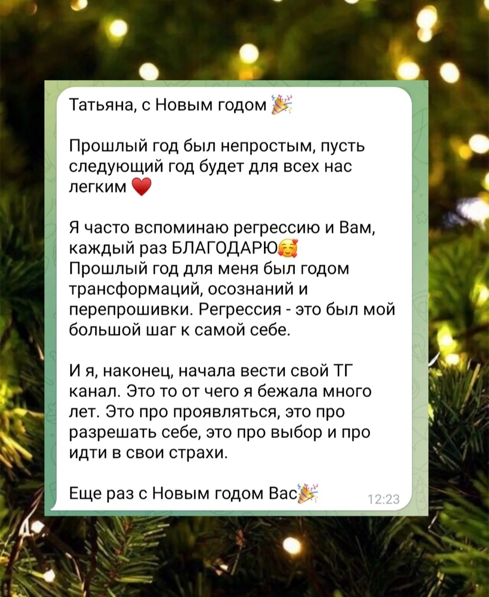 С Новым годом, дорогие! И пусть он принесёт мир и покой нашим сердцам ❤️🪽 Я благодарна за прекрасных клиентов и подписчиков! Радуюсь вашим результатам вместе с вами.Так приятно получать ваши отзывы и благодарности 🫶✨🧡 Я Татьяна и я провожу сеансы регрессии в прошлые жизни и к Высшим аспектам, а также делаю нумерологические расклады по методу Матрица судьбы. Больше информации в закрепленных статьях или по ссылкам: Если желаете пройти сеанс регрессии, получить нумерологический разбор по вашей дате рождения или заказать сеанс с Н., напишите мне в телеграм: