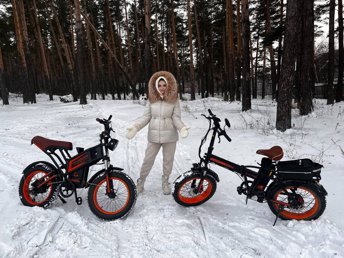 У нас два электрических велосипеда от одной и той же фирмы. Модели достаточно похожие между собой по техническим характеристикам. Один велосипед непосредственно наш, а другой - родственника, но зимует он у нас в гараже. Наша модель называется Kugoo Kirin V5. А модель родственника - Kugoo Kirin V4 Pro. Размер колес и мощность мотора у них одинаковая. Основное отличие в конструкции рамы. У нашего велосипеда она "более мопедная" а у второго велосипеда она складная. Моторы у обоих велосипедов по 500 ватт. Максимальная скорость сильно зависит от веса водителя. Мы разгоняли до 45 километров по асфальту. Сегодня мы катались по лесу. Температура на улице-10 градусов. До этого использовали велосипед при-20 градусов.