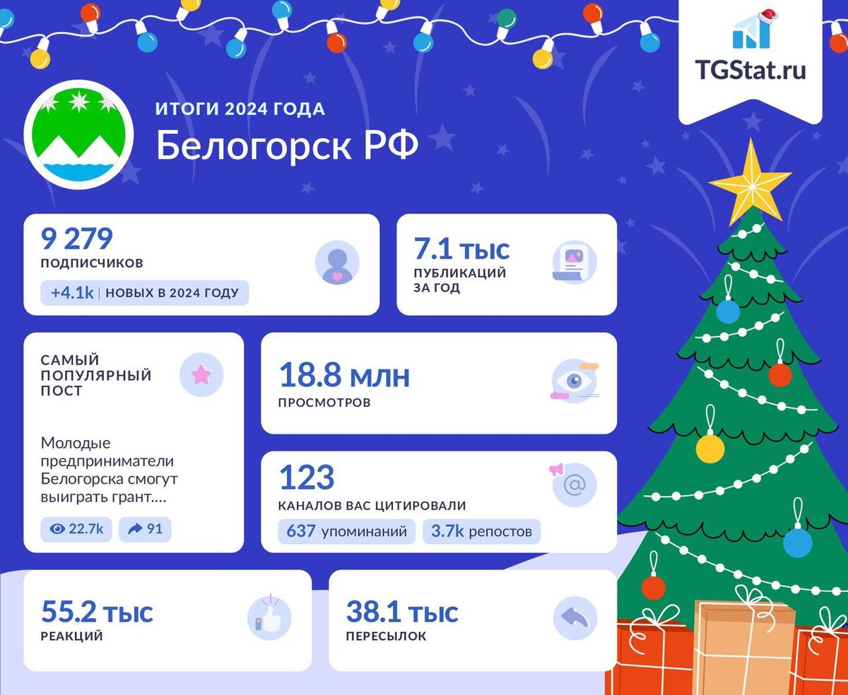 Муниципальное телеграм-сообщество Белогорска подводит итоги 2024 года. Традиционно оценить развитие телеграм-каналов сразу по нескольким ключевым показателям помогает специальный новогодний бот @TGStat_Bot Так, официальный телеграм-канал Белогорск РФ за год прирос на 4,1 тыс уникальных подписчиков и к 1 января 2025 года число читателей канала выросло до 9279. За год Белогорск РФ разместил 7,1 тыс публикаций. Самой популярной стала новость о том, что молодые предприниматели Белогорска могут выиграть грант. Число просмотров поста составило более 22,7 тысяч, а переслали его 91 раз. Общее число просмотров канала составило 18,8 млн. При этом цитировали Белогорск РФ 123 канала, сделав 637 упоминаний и 3,7 тысяч репостов. 38,1 тысячу пересылок сделано с канала за год. Новости собрали 55,2 тысяч реакций.