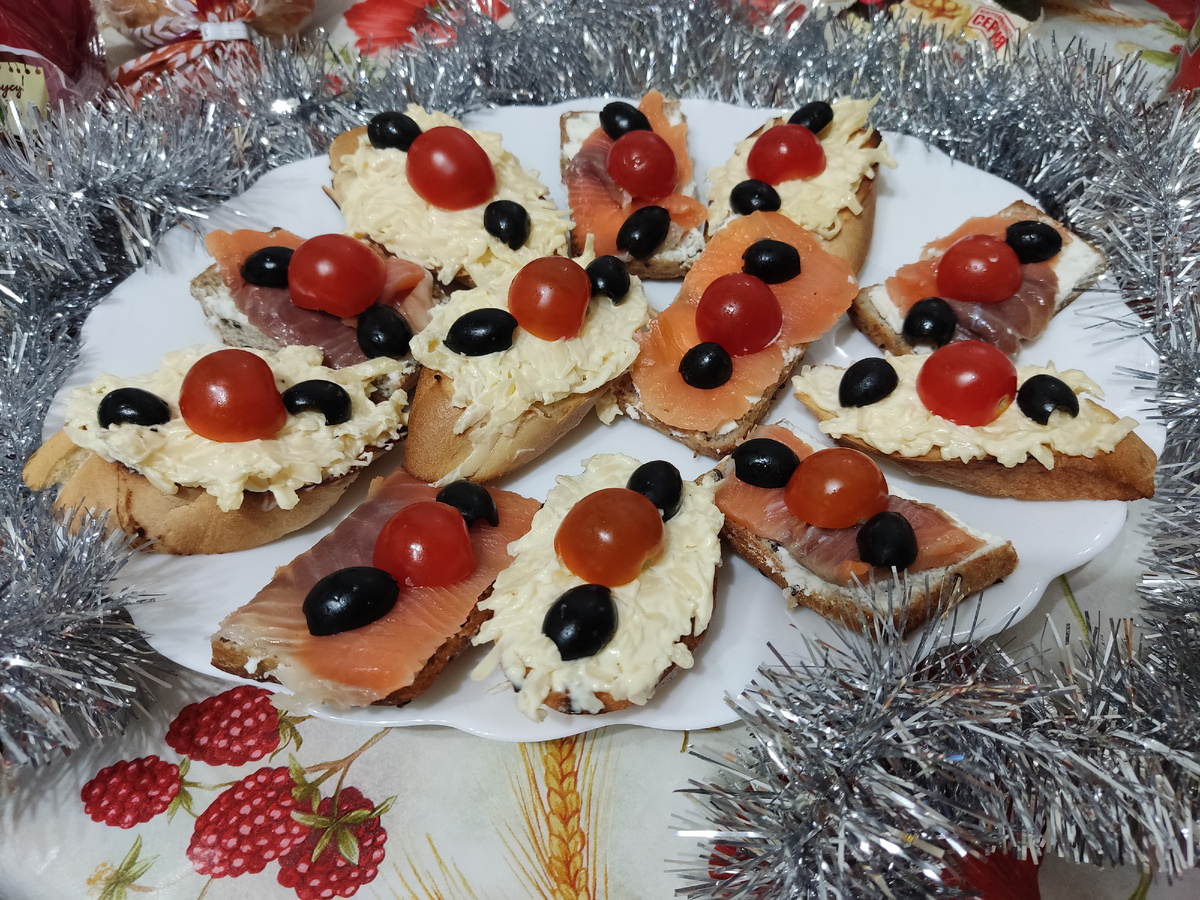 Перед вкусным ужином нужно подготовить наш организм , поэтому приготовим лёгкие закуски на наш праздничный стол. Для этого нам понадобится : Багет -1 шт. Сливочный сыр - 300 гр. Сыр твердых сортов - 300 гр. Лосось слабосолённый - 450 гр. Чеснок -4 зубчика. Майонез - 250 гр. Помидоры черри - 7 шт. Оливки - 12 шт. Багет поджариваем на сухой сковороде . Твердый сыр натираем на крупной тёрке и смешиваем с чесноком и майонезом. Смазываем кусочек багета и украшаем помидорами черри и оливками. Берём следующий кусочек багета и смазываем сливочным сыром и кладём кусочек слабосолённого лосося. Украшаем так же помидорами черри и оливками. Приятного аппетита мои хорошие !!!
